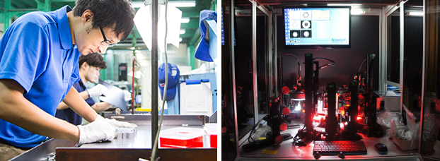 そこで、当社では人と、画像検査機を組み合わせ、全数検査による傷やワレの問題や、凹みなどの問題をなくすよう、取り組んでいます。社内工程では、一部不良が出てしまいますが、お客様先に納品する製品においては、品質不良ゼロをお約束いたします。