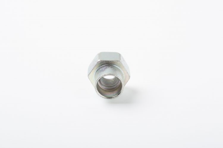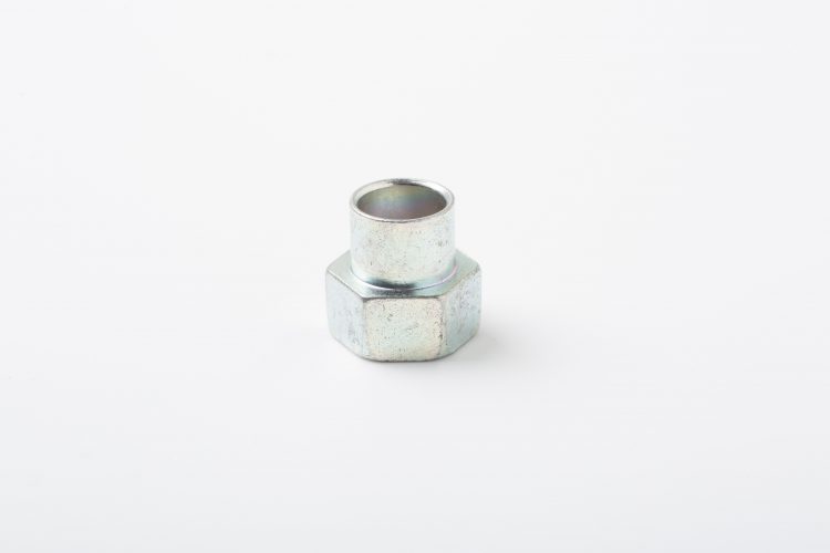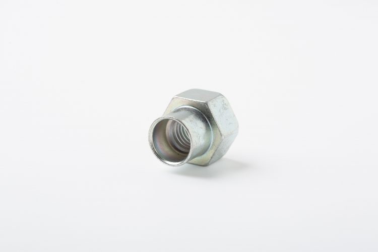 こちらは特殊ナット・カラー製造.comで加工した、特殊ナット製品の一つです。本製品は通常の六角ナットに対してスペーサーの機能も持たせた筒状部を設けており、貫通穴に対してこのスペーサー部の差し込みを行い、ねじ部で締結を行っています。いわゆる、六角ナットとスペーサーの一体成型品となっている特殊ナット製品です。