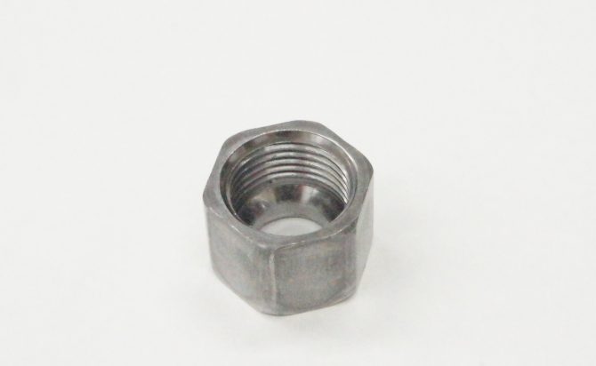 こちらは、特殊ナット・カラー製造.comで製造を手掛けた、配管部品として使用される特殊ナットです。ネジ山をつけ端面にテーパーをつけている点が特長と言えます。ロット20,000個という量産品となる為、1個当たりのコストを抑えた生産が求められており、フォーマーを用いてることでコストを抑えた生産が可能となっています。